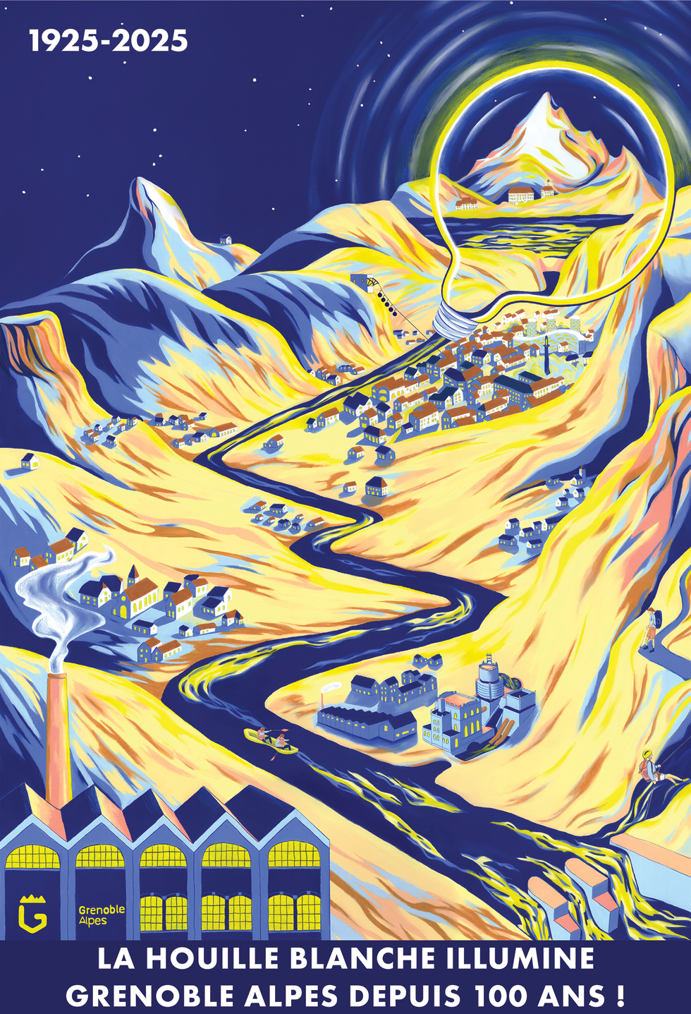 "Dans cette œuvre vibrante, l’eau serpente, nourrissant le territoire. Elle dévale les flancs lumineux des montagnes et berce les vallées. Au loin, une ampoule, immense et lumineuse, couronne un sommet enneigé, symbole éclatant de la houille blanche, cette énergie qui transforme l’eau en lumière. Des sommets aux vallées, la vie s’écoule, rythmée par le souffle de l’eau et le battement de l’innovation. Ici, la nature et l’industrie s’entrelacent dans un mouvement perpétuel, tissant un hymne lumineux à l’harmonie entre les hommes, l’énergie et les montagnes éternelles."